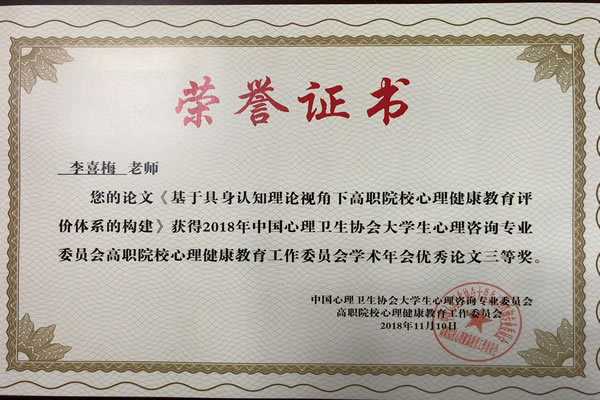 本届学术年会以“高校心理健康教育中国特色的形成与挑战”为主题, 来自全国各省、市高职院校200余名院校领导和老师代表围绕心理健康教育进行了广泛交流。会议期间,我校李喜梅老师的论文《基于具身认知理论视角下高职院校心理健康教育评价体系的构建》荣获年会优秀论文三等奖。