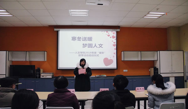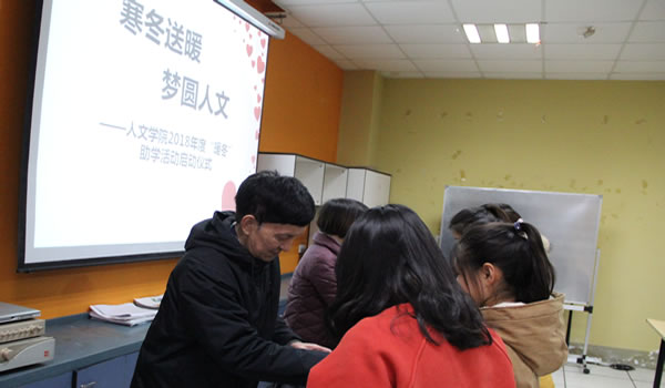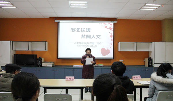 为给家庭困难的学生在寒冷的冬日送去温暖,人文学院根据学校“暖冬”助学总体要求,于12月7日在2B305举行了“寒冬送暖梦圆人文”2018年度“暖冬”助学活动启动仪式。人文学院党总支书记胡艳妹、人文学院关工委副主任顾大可、关工委委员顾利亚及杨锡斌、人文学院辅导员以及由家庭经济困难学生组成的阳光志愿服务队成员参加了启动仪式。