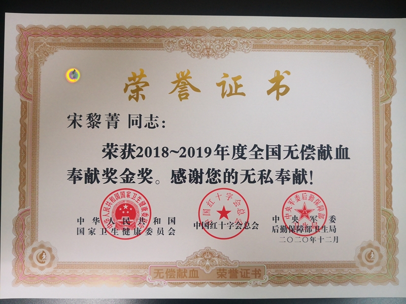 热心公益事业,积极参加无偿献血20年,累计献血2万毫升。2020年获国家卫生健康委员会等部门联合颁发的2018-2019年度全国无偿献血奉献奖金奖、2018年获2016-2017年度全国无偿献血奉献奖铜奖荣誉证书。