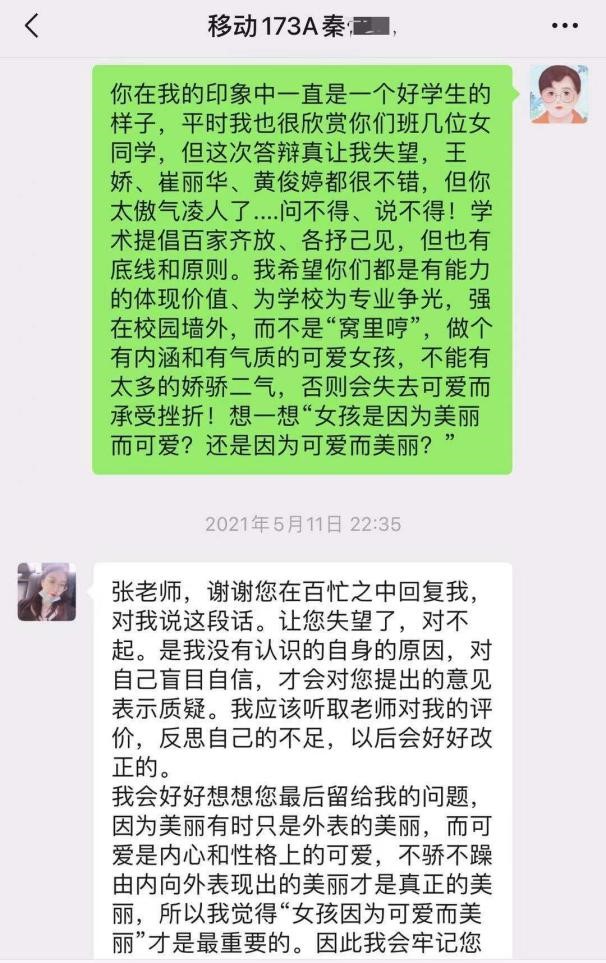 2021届移动商务专业毕业论文答辩时,平时积极参加直播活动的秦同学在答辩过程中傲气凌人,针对答辩老师提出的问题不以为然,答辩很不配合。针对秦同学情绪和态度上的变化,分析其原因可能是多次直播活动让她自我感觉过于良好,认为自己主播专业技能已经过硬,不知不觉将“娇骄二气”表现了出来。答辩现场顾及秦同学的自尊心,从专业的角度旁敲侧击的引导所有答辩同学要有严谨的学术作风、虚心的学术态度。答辩结束后利用微信与秦同学进行了谈心,通过引导她思考“女孩是因为可爱而美丽?还是因为美丽而可爱?”话题,鼓励她要有扎实的能力去体现自身价值、为学校为专业争光,做个有内涵和有气质的可爱女孩,并同时例举了同届崔丽华、王娇等优秀同学的表现。通过交流,秦同学及时端正了态度,重新回到“好学生”的状态。