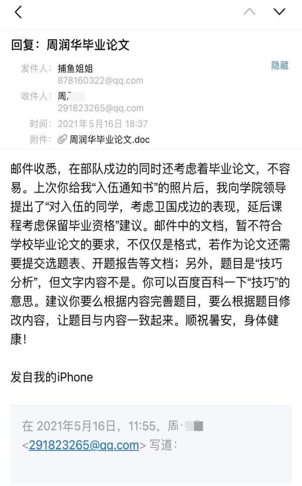 2016年始,宁夏等西北省份的学生走进了电子商务专业,这些学生普遍学习能力、专业基础薄弱,有些学生的养成习惯较差。宁夏电商1633班的周同学在2018年7月离校回家后就一直没有再回校,“三毕”课程一直挂着,2021年年初周同学从部队发来了一封电子邮件,告知已经入伍并提出要毕业证书。于是在来往的邮件中多次与周同学进行交流,不仅点赞他为国戍边的行为,更鼓励他要努力最后一步,独立完成自己的学业,最后周同学接受了建议在向学校提出保留学籍的申请中做出了承诺保证。