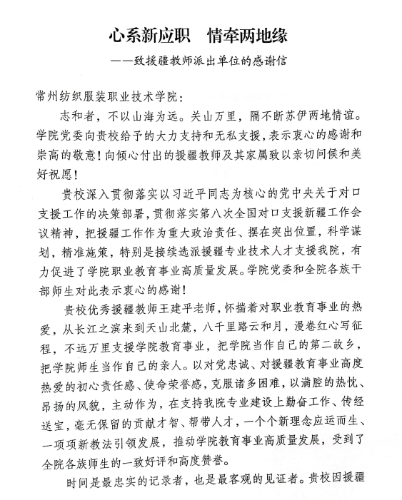 近日学校收到来自新疆应用职业技术学院党委的一封题为《心系新应职 情牵两地缘》的感谢信。感谢我校纺织学院王建平老师两赴新疆,支援新疆应用职业技术学院建设。