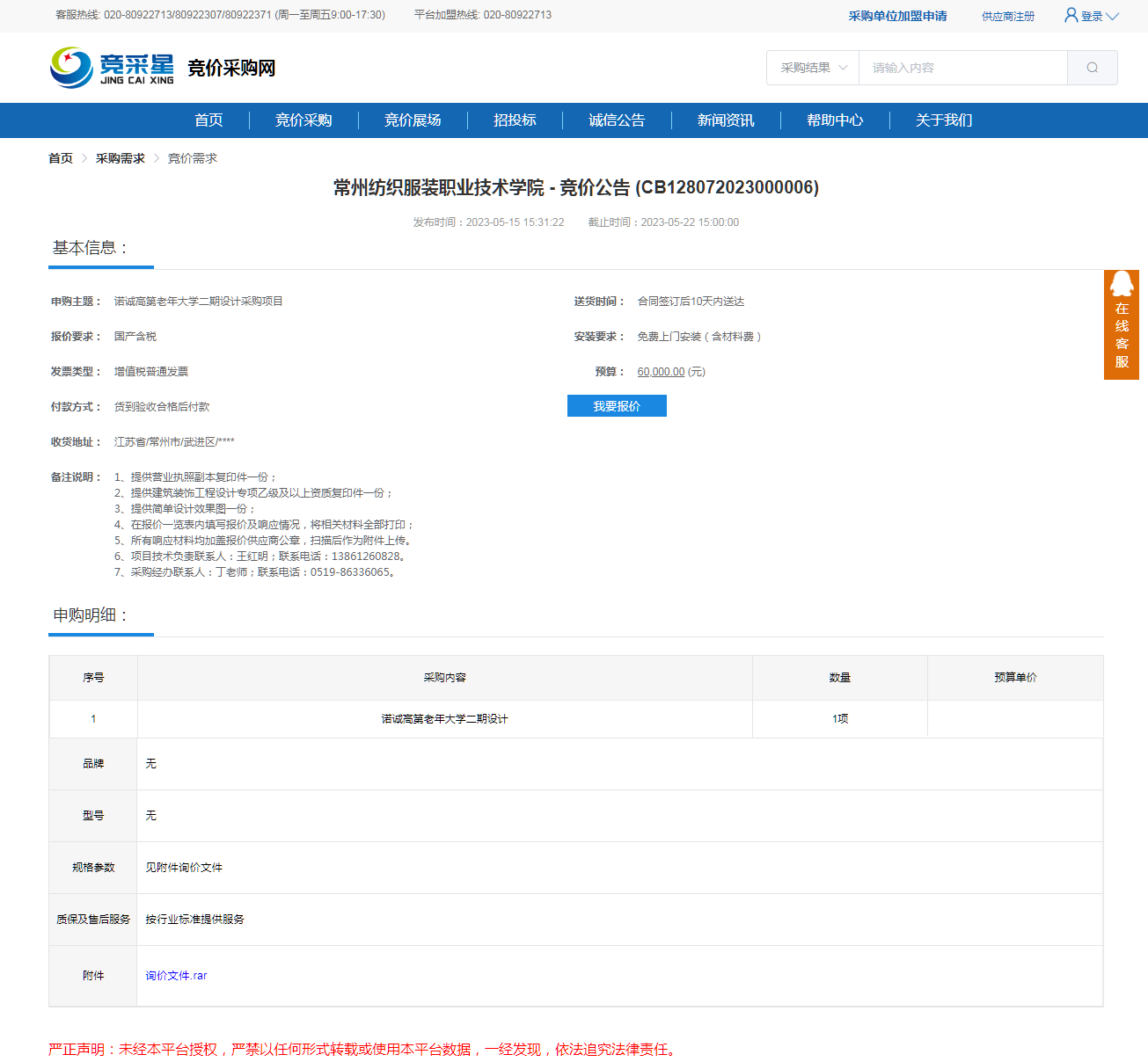 【采购公告】诺诚高第老年大学二期设计采购项目询价公告
