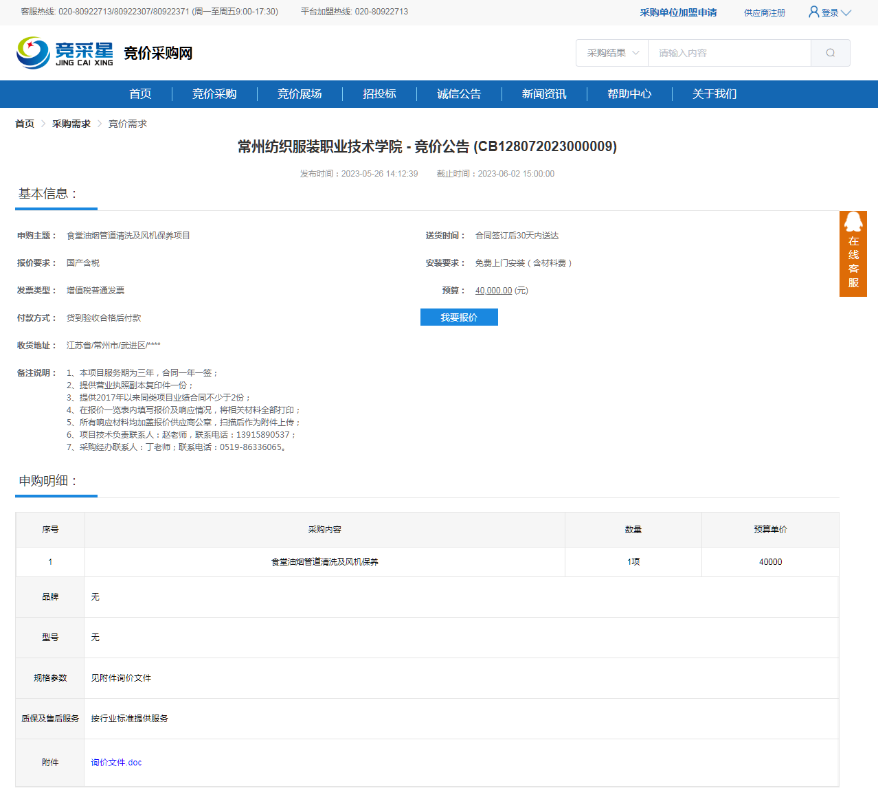 【采购公告】食堂油烟管道清洗及风机保养项目询价公告