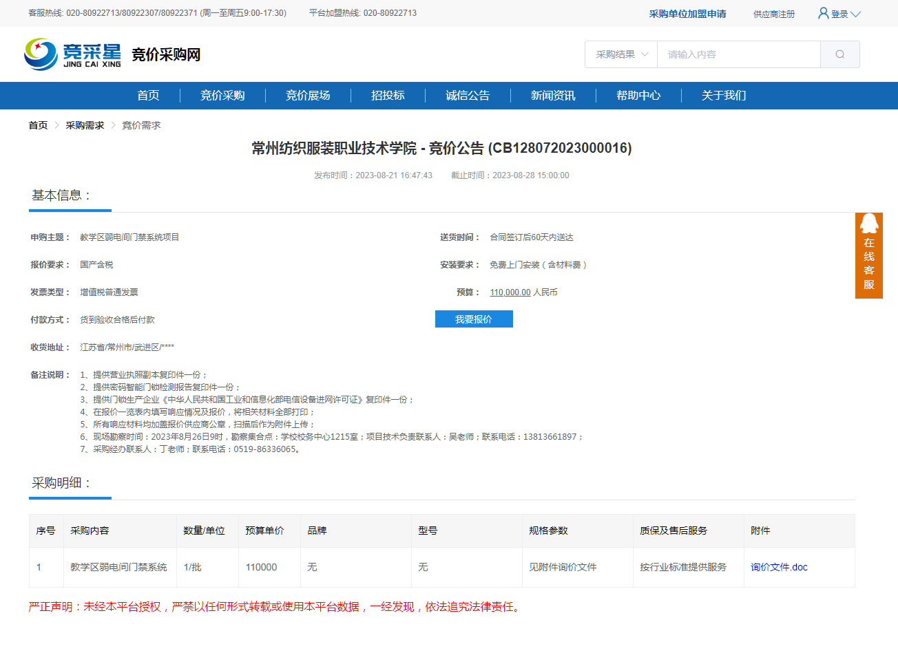 【采购公告】教学区弱电间门禁系统项目询价公告