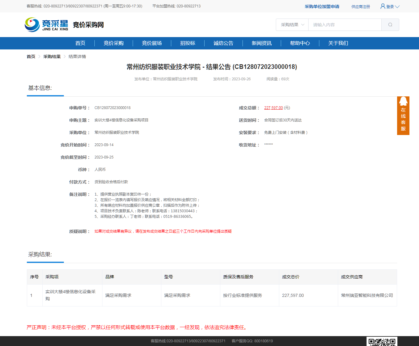 【成交公告】实训大楼4楼信息化设备采购项目成交公告