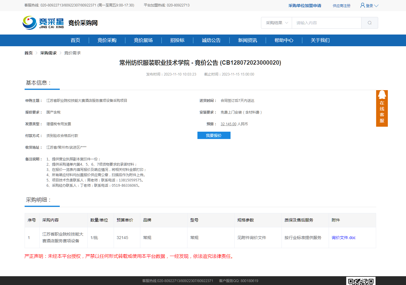 【采购公告】江苏省职业院校技能大赛酒店服务赛项设备采购项目询价公告