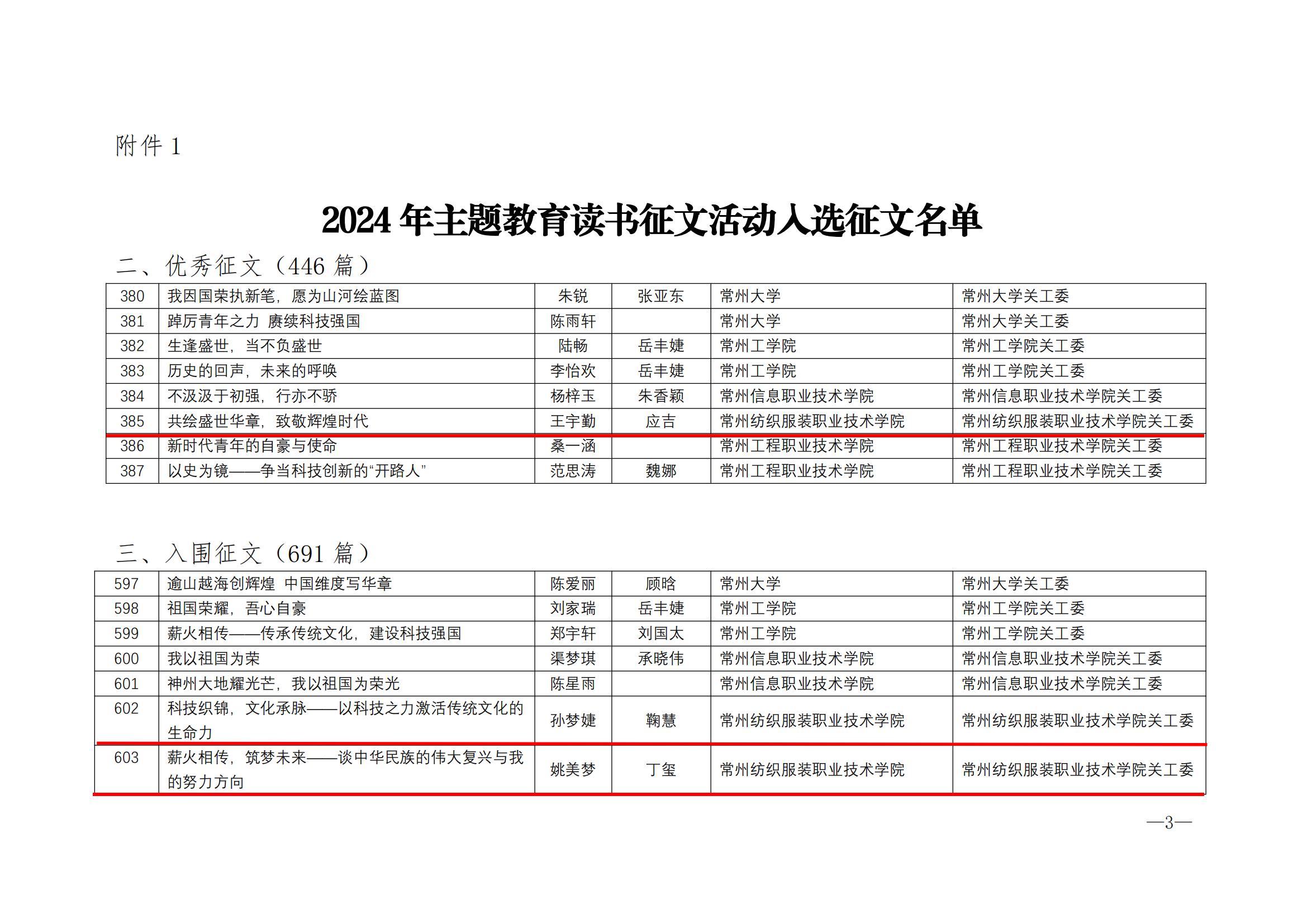 近日,江苏省教育系统关工委下发了《关于公布2024年主题教育读书征文活动入选征文名单的通知》苏教关委〔2024〕15号,我校推荐的智能纺织材料学院王宇勤同学作品《共绘盛世华章,致敬辉煌时代》(指导老师:应吉)获评优秀征文,智能纺织材料学院孙梦婕同学作品《科技织锦,文化承脉——以科技之力激活传统文化的生命力》(指导老师:鞠慧)和智能制造学院姚美梦同学作品《薪火相传,筑梦未来——谈中华民族的伟大复兴与我的努力方向》(指导老师:丁玺)分别获评入围征文。