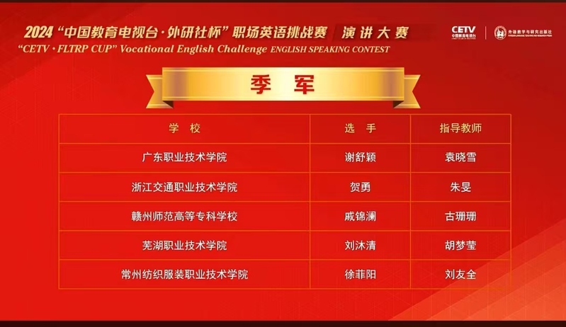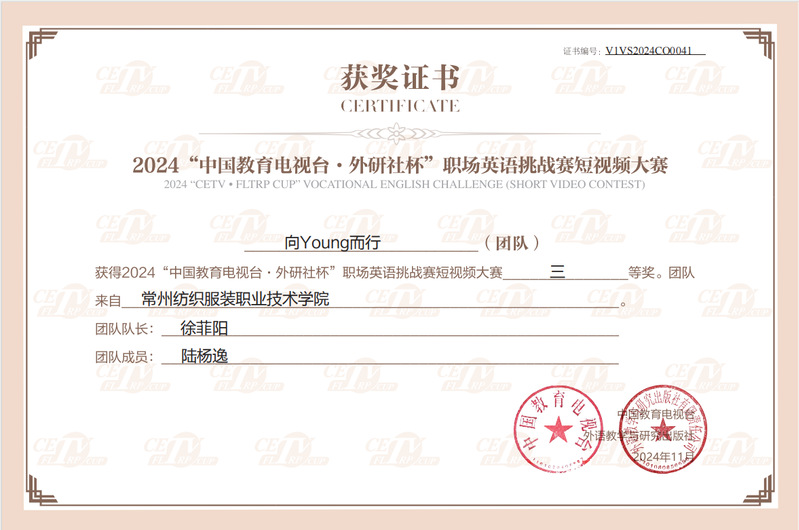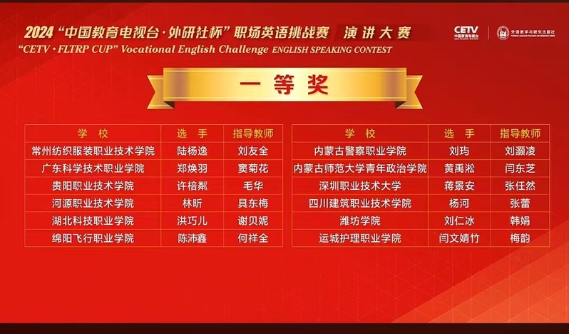 2024年“中国教育电视台外研社杯”职场英语挑战赛章程4月发布,人文与健康学院党政领导精心组建了参赛团队,为大赛提供全方位保障。经过校赛、省赛和网络赛道多轮比拼,商英2331班徐菲阳、商英223本班陆杨逸从众多参赛选手中脱颖而出,获得代表江苏省参加全国演讲大赛决赛的名额。代表江苏省参加国赛的选手共有7名,我校是江苏省唯一一所两名选手入选国赛的高职院校,也是全国所有入选国赛超过1人的三所高职院校之一。在全国决赛场上,来自全国30个省、自治区、直辖市的优秀职教选手竞技语言,激荡才思,经过四轮激烈的竞争,我校两位选手凭借稳定出色的发挥,徐菲阳斩获全国特等奖(季军),陆杨逸获得全国一等奖(第一名)。在新增的短视频赛道,徐菲阳团队以“新质生产力-打造新能源之都”为主题,用英文呈现了常州新能源产业的快速发展,向世界推广了常州这座充满活力的江南城市,获得全国三等奖。