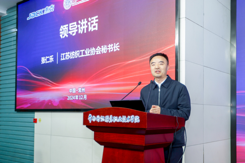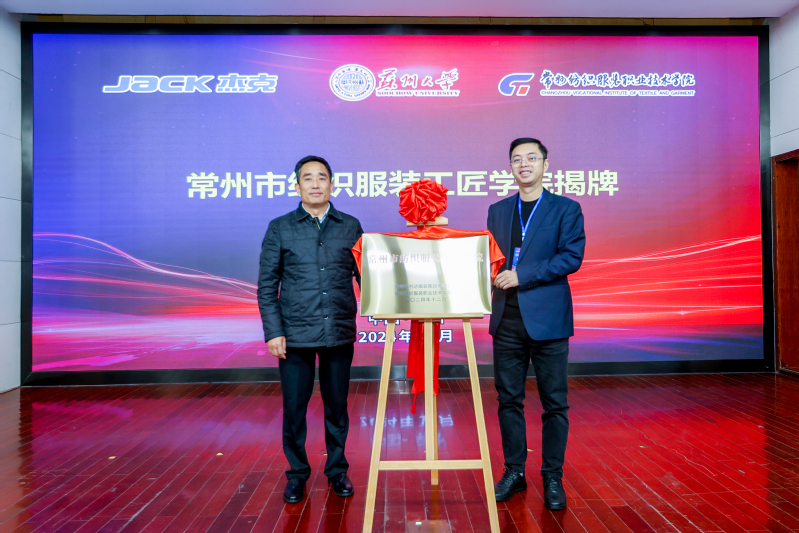 杰克科技股份有限公司总裁胡文海对共同体成立以来的工作进行了总结,并制定了下一年度工作计划。党委副书记、校长洪霄、杰克科技总裁胡文海分别代表双方签署了“校企协同创新合作协议”,通过共建服装智能制造技术创新与应用平台,进一步深化校企合作。常州市科教城管委会副主任庄三舵、常州华利达服装集团有限公司副书记钱震宏共同为“常州市纺织服装工匠学院”揭牌,希望通过共建工匠学院,培养更多具备工匠精神的纺织服装人才,推动纺织服装行业技术创新。为表彰杰克科技在产教融合领域做出杰出的贡献,校党委委员、副院长张文明代表我校授予杰克科技产教融合“突出贡献奖”。江苏省纺织工业协会副秘书长张彬发布了江苏省2025年《缝纫机械装配调试工》职业技能等级认定,这将为服装智能制造领域的人才培养标准和技能评价规范。我校智能制造学院院长李爱红发布了我校机电一体化技术(服装智能装备方向)人才培养方案。浙江赛唯数字能源总经理潘建国发布了服装智能制造企业人才与技术需求。