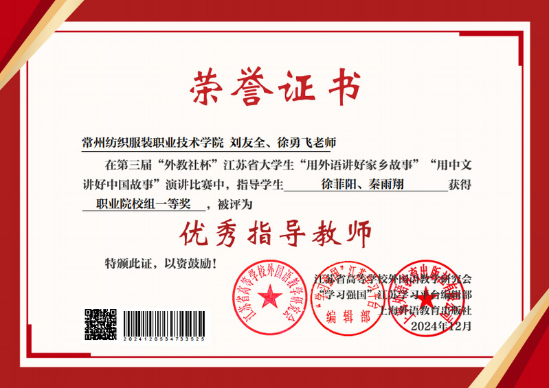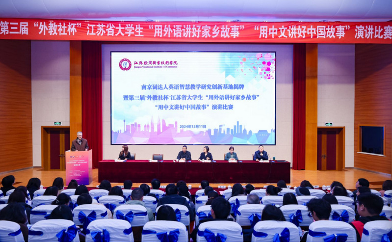近日,由江苏省高等教育学会指导、江苏省高等学校外国语教学研究会、“学习强国”江苏学习平台、上海外语教育出版社主办,江苏经贸职业技术学院承办的第三届“外教社杯”江苏省大学生“用外语讲好家乡故事”“用中文讲好中国故事”演讲比赛决赛顺利举行。