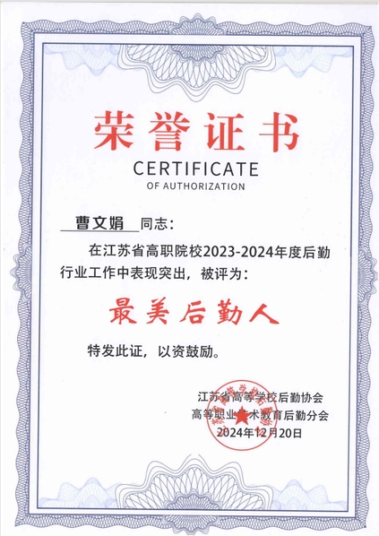 喜报:我校荣获2023-2024年度江苏省高职院校后勤行业先进单位、曹文娟获得“2023-2024年度最美后勤人”