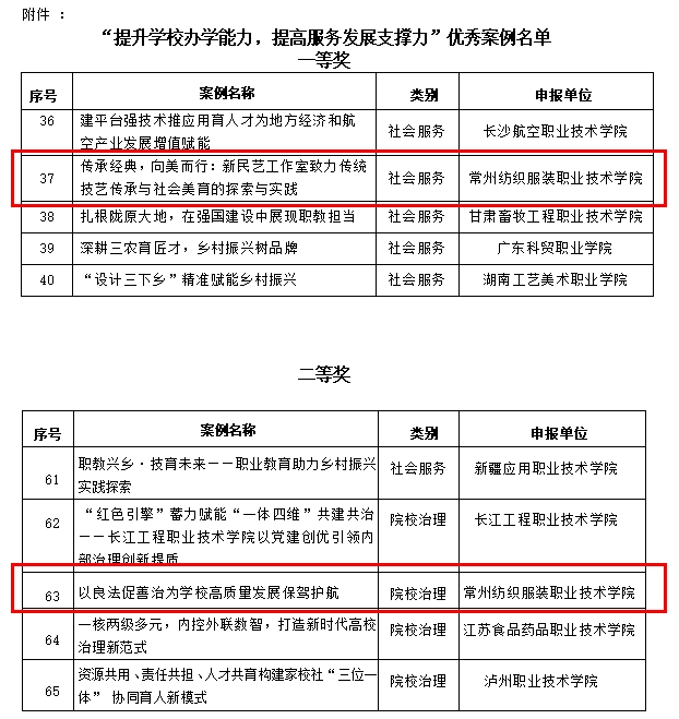 近日,全国高等职业学校校长联席会议发布了“提升学校办学能力,提高服务发展支撑力”优秀案例遴选结果名单,确定120个案例为优秀案例,我校申报的两项案例成功入选,喜获一等奖和二等奖。其中《传承经典,向美而行:新民艺工作室致力传统技艺传承与社会美育的探索与实践》展示了多年来学校始终致力于中华美育精神和优秀传统文化的传承与发展的最新成果,获一等奖;《以良法促善治 为学校高质量发展保驾护航》总结了我校推进依法治校,不断改革完善内部治理结构、管理体制和运行机制,打造“自治善治、共治法治、人本数治”的首善之校的典型经验,获二等奖。