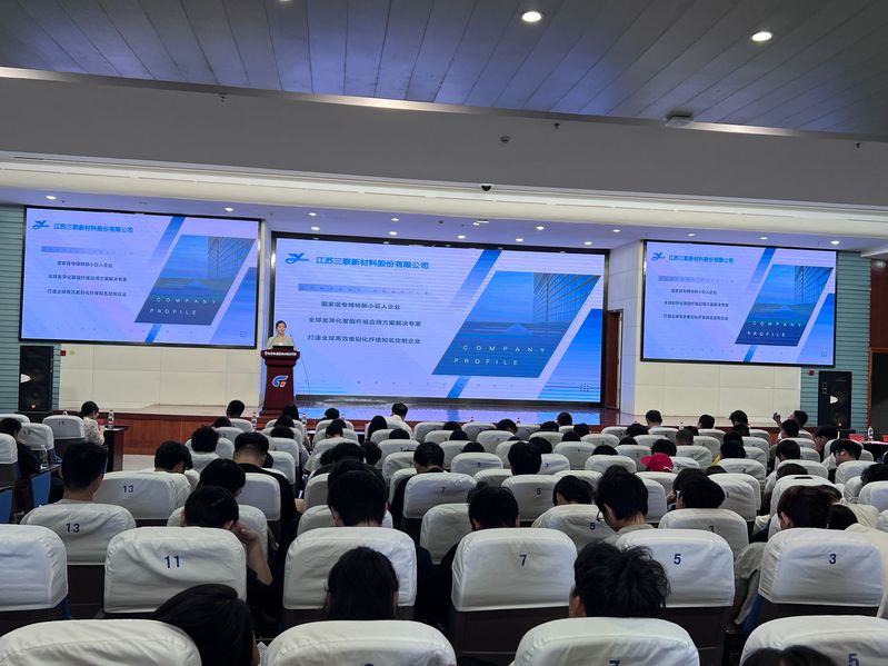 在企业集中宣讲环节,江苏三联新材料股份有限公司、江苏自然风纺织品有限公司、超美斯新材料(淮安)有限公司等十余家链上企业依次登场,通过PPT 展示、案例分享等形式,向在场学生全方位展示企业的发展历程、企业文化、核心业务、人才需求和职业发展路径,并分享了企业在技术创新、产品研发等方面的成果。企业宣讲结束后,现场响起热烈掌声,学生们纷纷就关心的岗位细节、职业发展等问题与企业代表互动交流,气氛热烈而活跃。