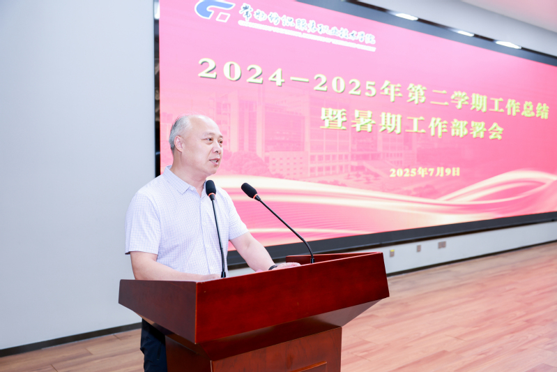 会上,洪霄从强化政治统领,推进省委巡视与长效监督机制建设;创新思政模式,构建“大思政”协同育人新格局;深耕教学改革,实现专业内涵与课堂质量双提升;强化科技赋能,增强科研创新与产业服务效能;夯实人才根基,打造高水平师资与双岗互聘生态;深化职教出海,扩大留学品牌与国际合作能级;优化治理体系,提高校园保障与服务满意度;增强服务保障能力,共建师生满意校园等八个方面系统总结了学校上半年工作成效。他重点分析了上半年部分工作进展缓慢的原因,并就加快推进工作作了具体要求,同时指出既要直面重点工作推动落实不力、人才培养质量不高、师资队伍建设乏力等突出问题,更要看到巡视整改带来的发展契机。接着对暑期工作进行了部署安排,提出了巡视整改、推进省综合考核、学校突出问题系统整治、深入贯彻中央八项规定精神学习教育、信息化建设专项监督、安全教育与管理、职称评审、第六聘期岗位聘用、省高水平学校建设总结评估、“十四五”发展规划总结和“十五五”发展规划编制、制度建设、辅导员集中办公项目推进、2025级新生迎新筹备等十三项重点工作以及院长办公会议督办或专项督办应在开学前或开学初完成的工作,并明确了完成相关工作的责任部门、时间要求。