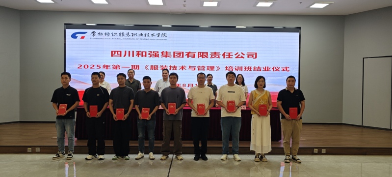 8月16日上午,四川和强集团2025年第一期《服装技术与管理》培训班结业典礼在领秀展厅隆重举行。四川和强集团有限公司副总经理岳精忠、生产管理处处长王晓芬、生产管理处一级主任科员温智林,我校党委委员、副校长张文明,服装与时尚设计学院相关负责人、教师代表和全体培训学员参加结业典礼。会议由服装与时尚设计学院院长袁红萍主持。