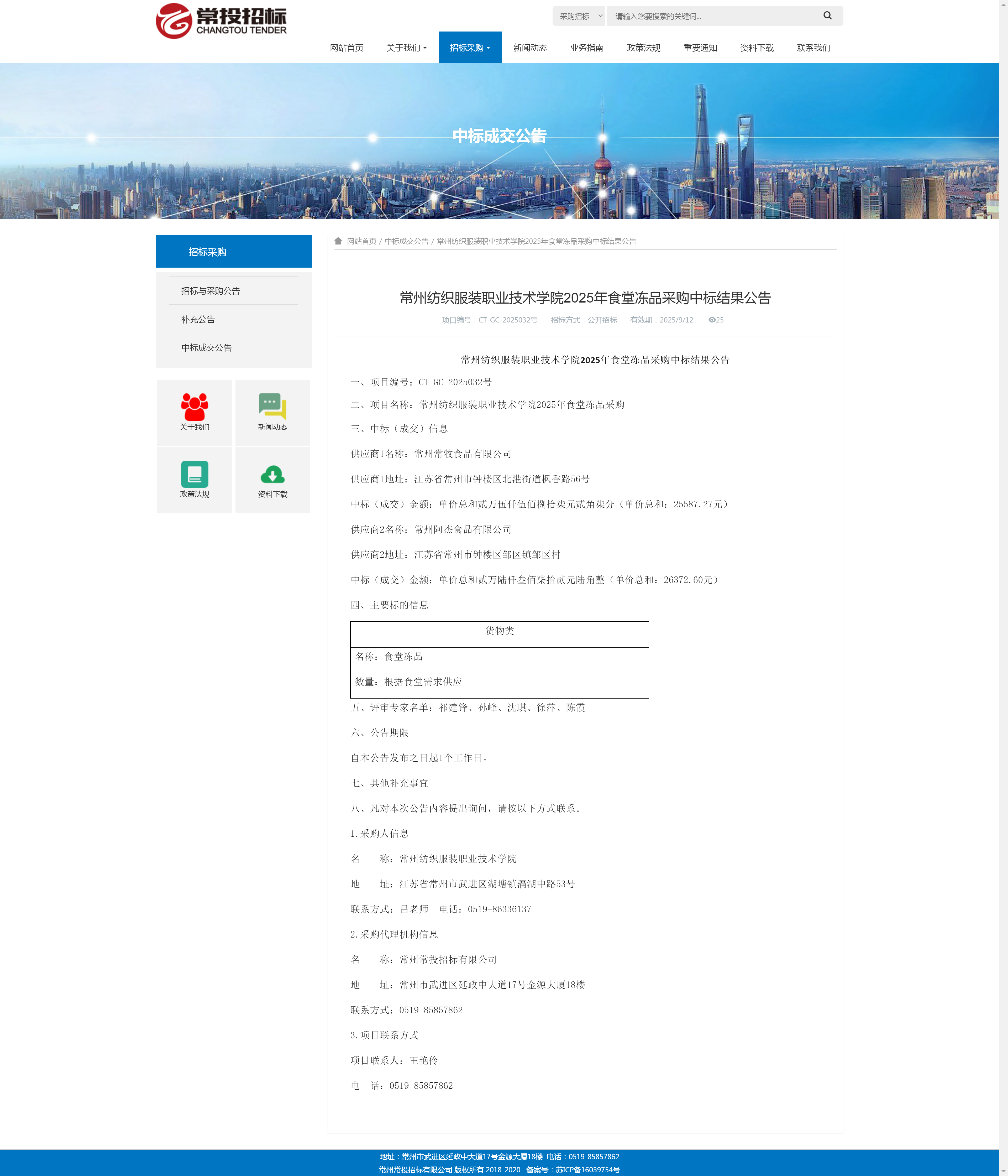 【中标公告】食堂冻品采购项目中标结果公告