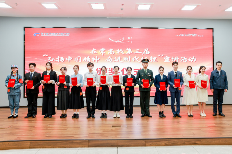 宣讲环节中,14位选手依次登台,围绕伟大建党精神、抗战精神、南泥湾精神、五四精神等中国共产党人精神谱系,结合自身成长经历、专业背景和实践感悟,以生动的语言、真挚的情感和创新的表现形式,讲述了新时代青年在强国建设、民族复兴征程中的奋斗故事。从“半条被子映初心”到“珠峰测高显担当”,从“土纱救国”到“两山”理念,选手们紧扣主题,从不同角度阐释了中国精神的丰富内涵与时代价值。他们的宣讲或慷慨激昂,或深情款款,或逻辑严密,或故事感人,既有历史厚度,也有时代温度,充分凸显了青年一代对中国精神的深刻理解与自觉传承,也展现了在常高校青年扎实的理论功底、开阔的时代视野和强烈的使命担当,现场掌声不断。